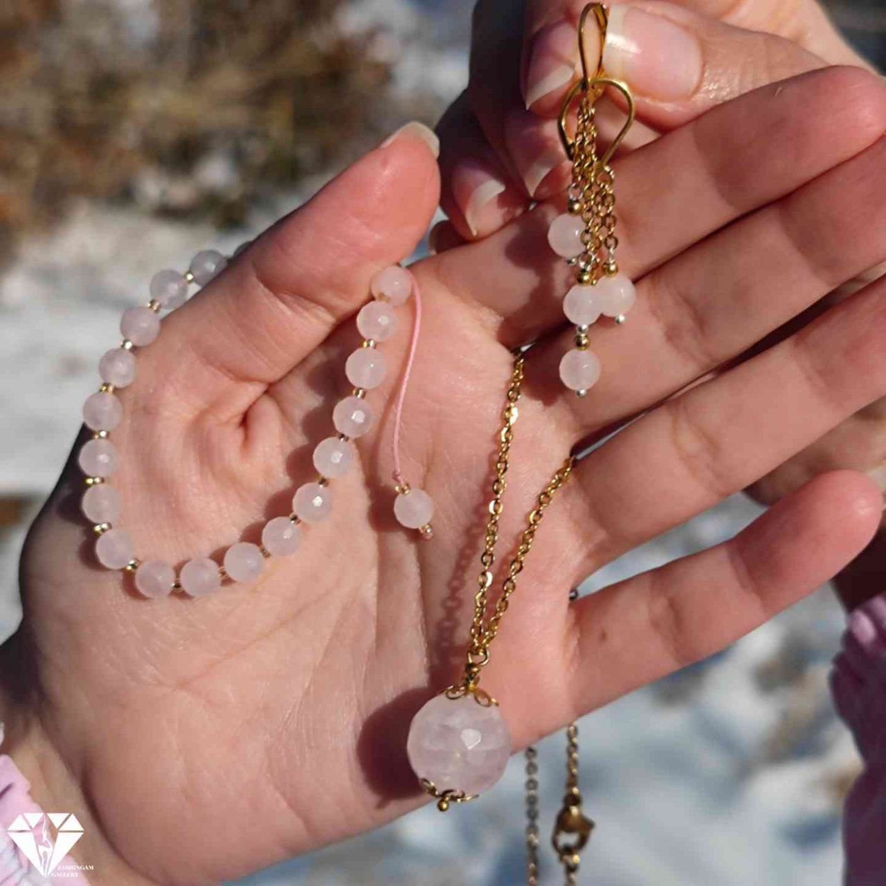 گردنبند دستبند و گوشواره ی رزکوارتز